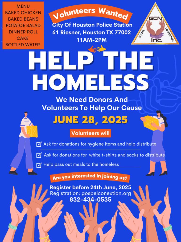 Gospel Co-Nextion is a faith-driven organization dedicated to serving and uplifting the community, making a positive impact since the aftermath of Hurricane Katrina. Our initiatives include providing hot meals to the homeless, collaborating with other nonprofits to distribute turkeys and school supplies, and hosting free, free homeowner’s consulting services, free music events that foster joy and connection, while getting the word out about our homeless condition here in Houston.
